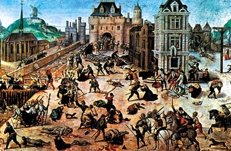 À partir de 1560 os protestantes da França ficaram conhecidos como huguenotes. Os huguenotes vieram a se tornar organizados e poderosos. O governo francês sentindo-se ameaçado passou do nível da perseguição violenta para guerra aberta. De 1562 – 1598 houve oito guerras e massacres. Desse modo a França voltou à Roma. No ano de 1572, no conhecido massacre de São Bartolomeu, por ter se iniciado no dia 23 de agosto, dia de São Bartolomeu, e se estendido ao dia 24; quase 20 mil pessoas foram chacinadas em Paris.